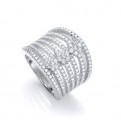 This ring has a solid base which halfway up feathers out into seven rows with a delicate flower detail delicately covered in cubic zirconia stones. A real show stopper!