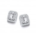 Sterling silver stud earrings with a rectangular clear baguette cut cubic zirconia stone surrounded by small round cubic zirconia stones