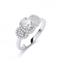 An enchanting single cubic zirconia stone surrounded by small dainty stones with two clusters of stones on either side gives this a twist on the classical trilogy ring